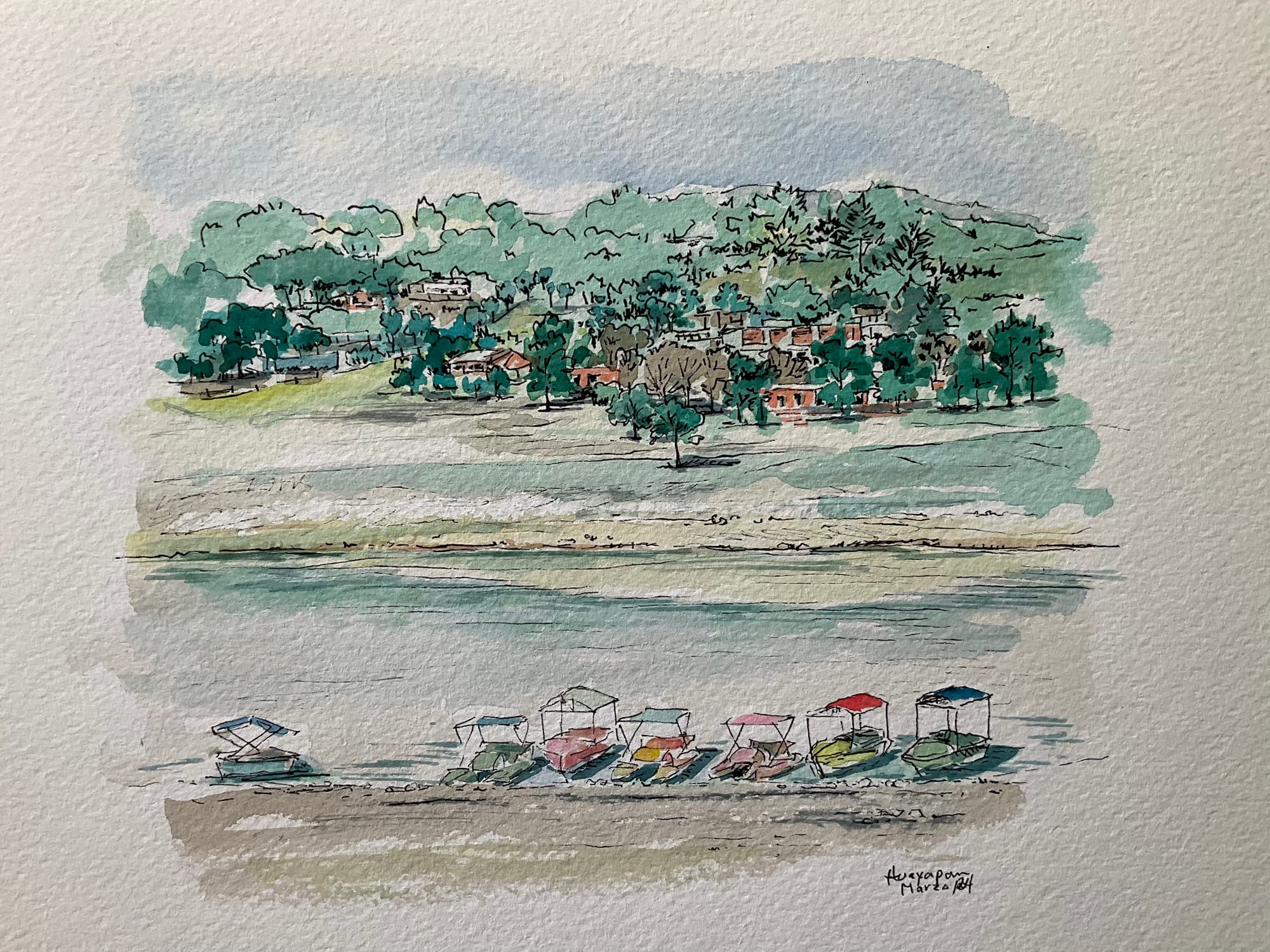 We painted the little pleasure boats at a dam near Huayapam, a short drive from the city of Oaxaca. No ocean here, no resorts, no beach vendors, a different kind of Mexico, quiet and still.