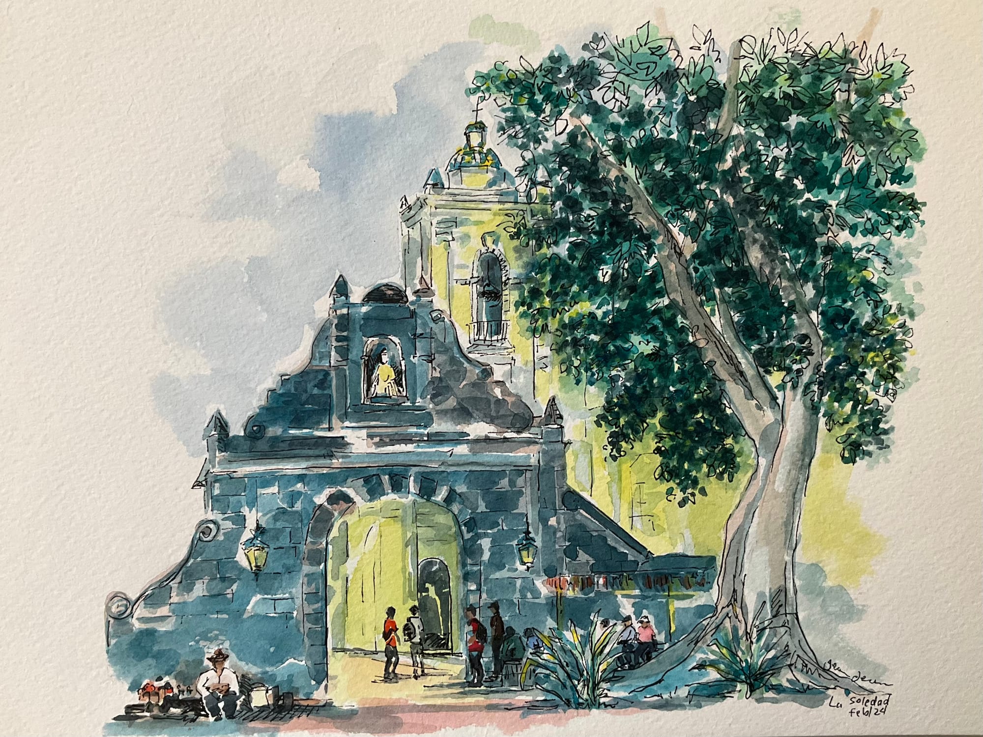 Here’s the picture I did sitting beside her in a dry fountain a few years ago at Soledad Church. My paints are beside me in the tiny white box.