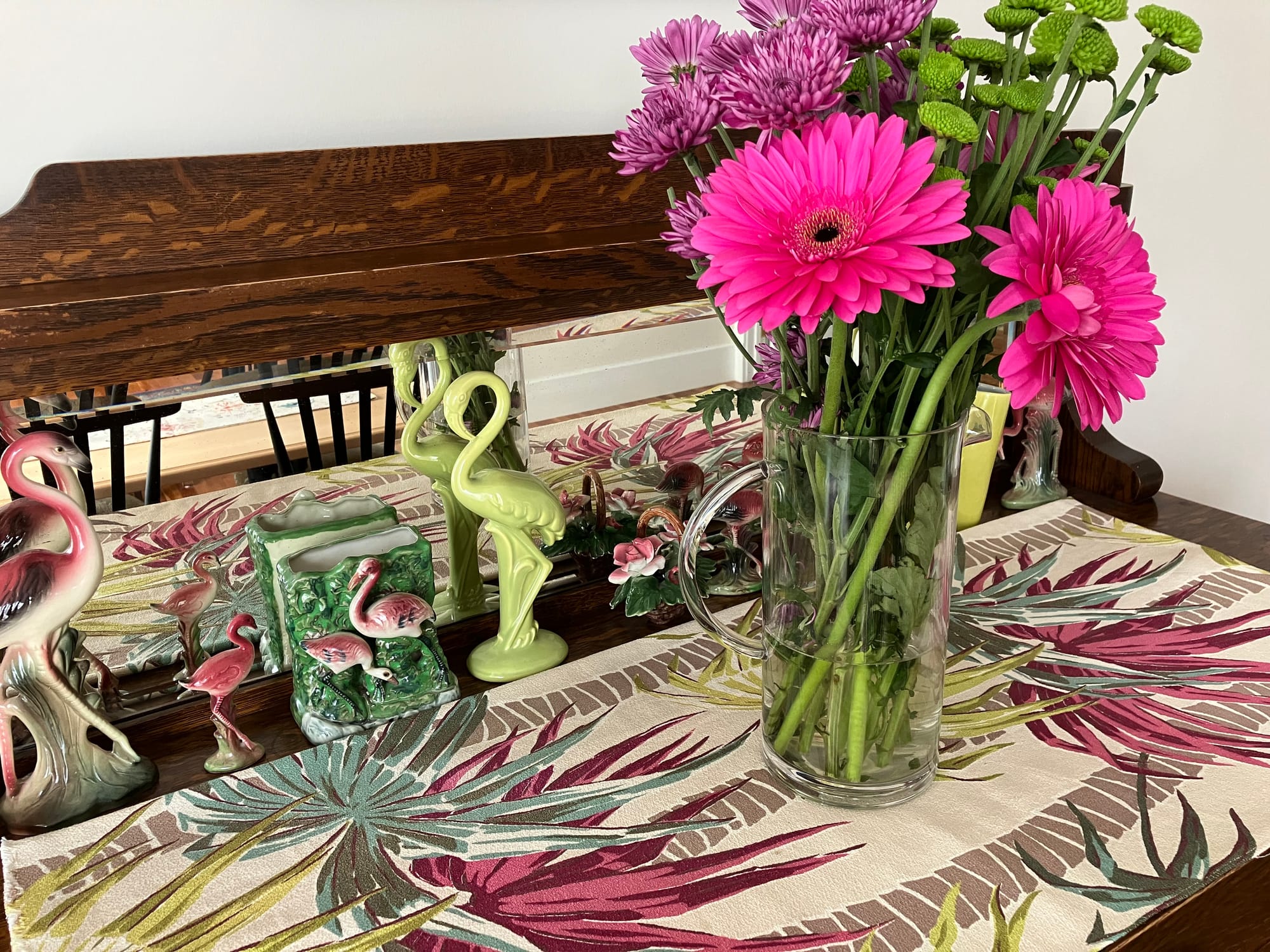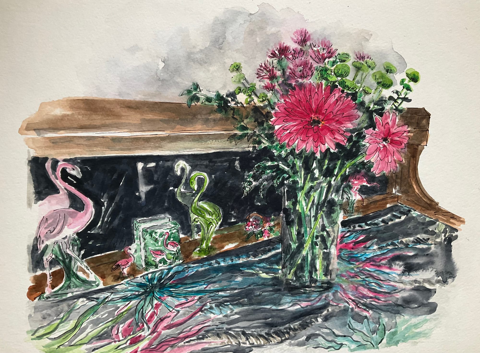 Other painters were working from photographs, all dabbing along in pleasant concentration. I had brought a photograph for inspiration: fresh flowers, kitschy flamingos and vintage barkcloth from my dining room buffet.